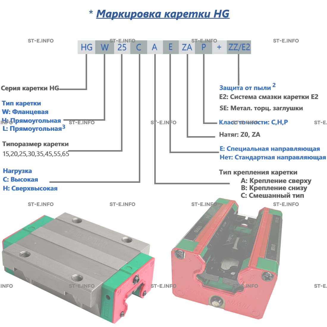 При замене вышедшей из строя каретки, зачастую известна только маркировка вида HG15, поскольку каретка установлена на станке, и другой информации нет. Данная маркировка расположена на торцевых уплотнениях и указывает только на серию и типоразмер направляющей. Этой информации недостаточно для точного определения конфигурации блока. Расширенное обозначение указано на установочной площадке корпуса каретки.
